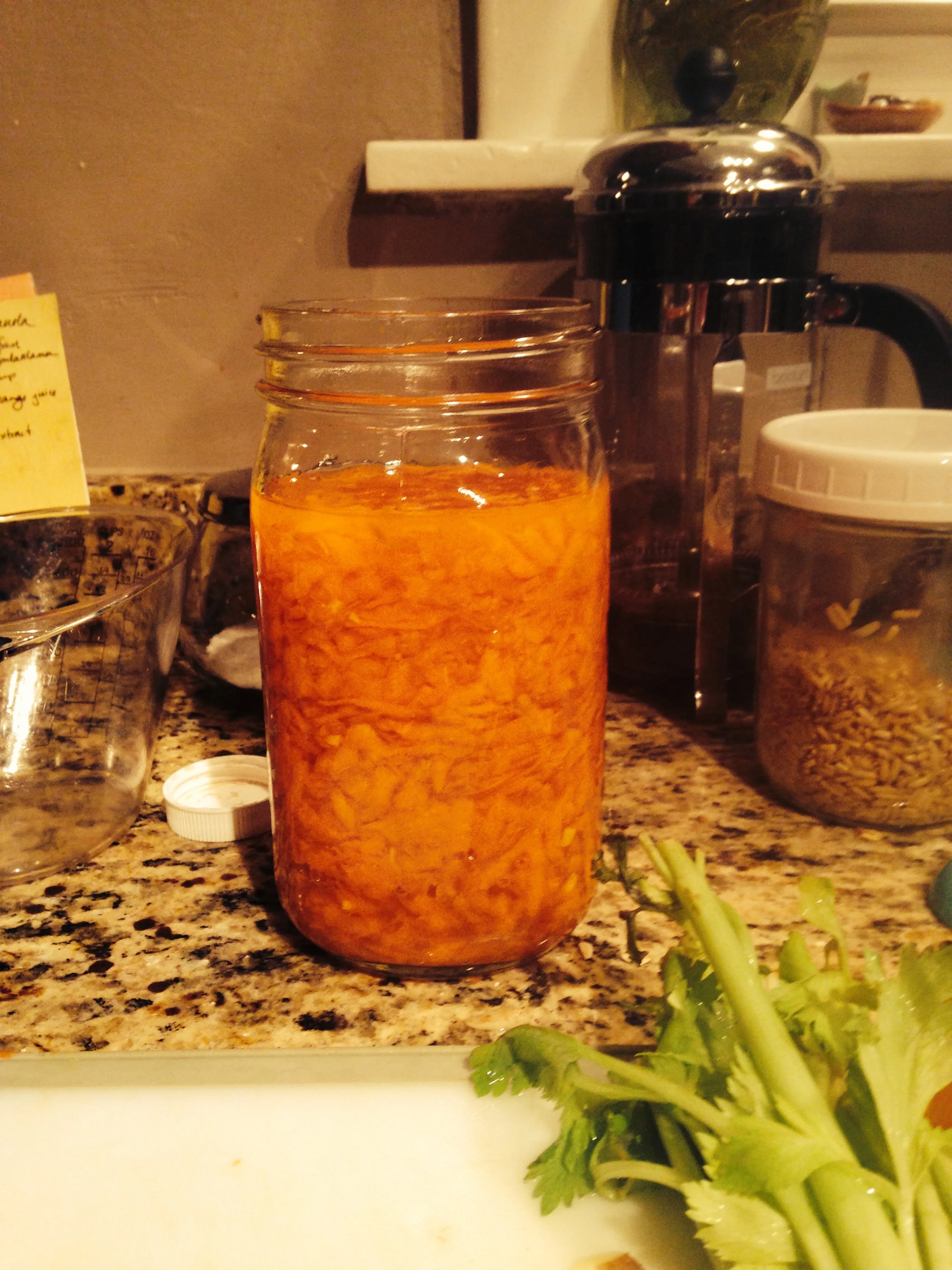 Fermented carrots have become another favorite of mine. I tried making sauerkraut last fall, but I don’t think it really turned out. While waiting for it to ferment, I also realized that I wasn’t really a fan of sauerkraut or even cabbage, so the idea of tasting my creation was never really appealing. However, when I found a recipe for fermented ginger-carrots, I decided to take another shot at fermenting vegetables. I figured that starting with favors that I already enjoy, was probably a good idea. The result was great! I love adding fermented carrots to salads! They are ready to use, packed full of nutrients, and add a ton of flavor.