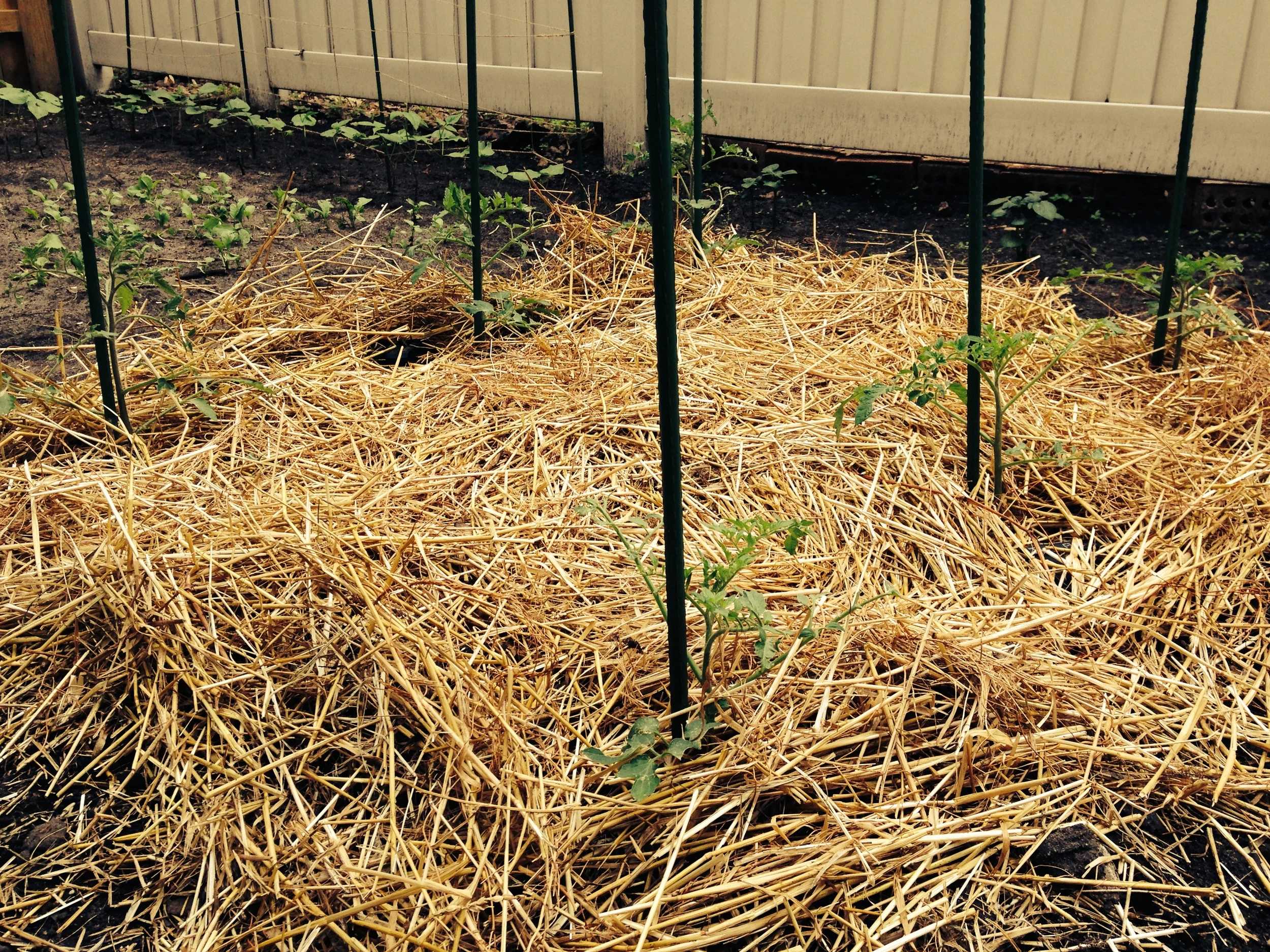 The biggest change in the garden has been the mulching of the tomatoes with straw. Last year I planted cheap tomato plants that I had purchased at a wholesale place. I had poor success with them, both in fruit quality and in plant health. Most of my plants got blight last year, which may have been in part due to the low-quality plants, but also probably because I didn’t know that tomato plants prefer to be clean! They don’t like having dirt splash up onto their leaves during rain or waterings. So, this year, I decided to prune my tomatoes (all quality heirloom varieties) to one vine and mulch them. I started by cutting off the lowest branches to make room for the mulch, then added the mulch. I’m planning to train them to one vine by cutting of the suckers. For me, I prefer more compact tomatoes that grow on stakes, because they help me to pack more into my little urban garden.