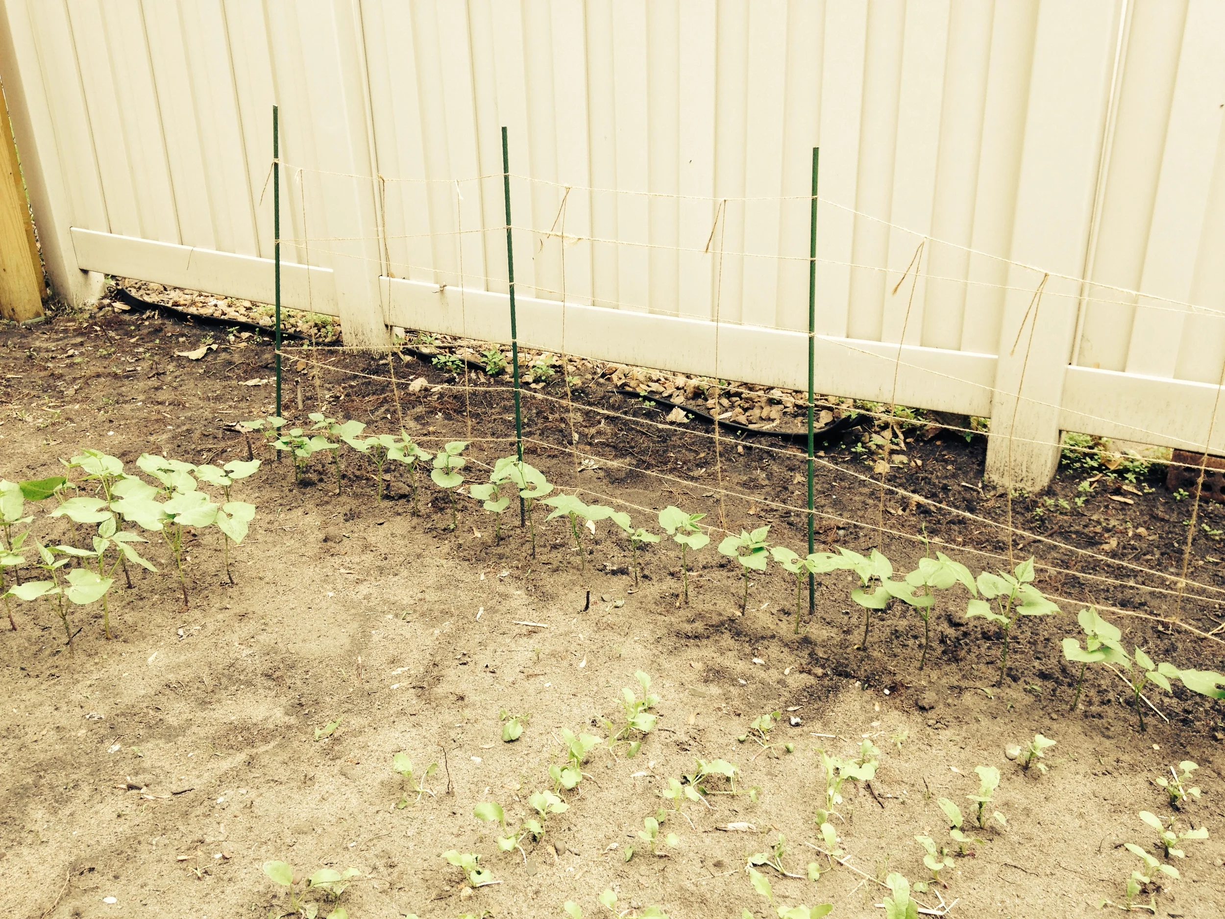 The beans are looking fantastic! The pole beans have a make-shift trellis that is going to get them climbing until a more permanent version is made. The radishes have been thinned and should be ready in the next couple weeks. The carrots are slowly starting to make an appearance between the rows of radishes. Carrots truly are a vegetable for the patient, but they are oh-so worth it!