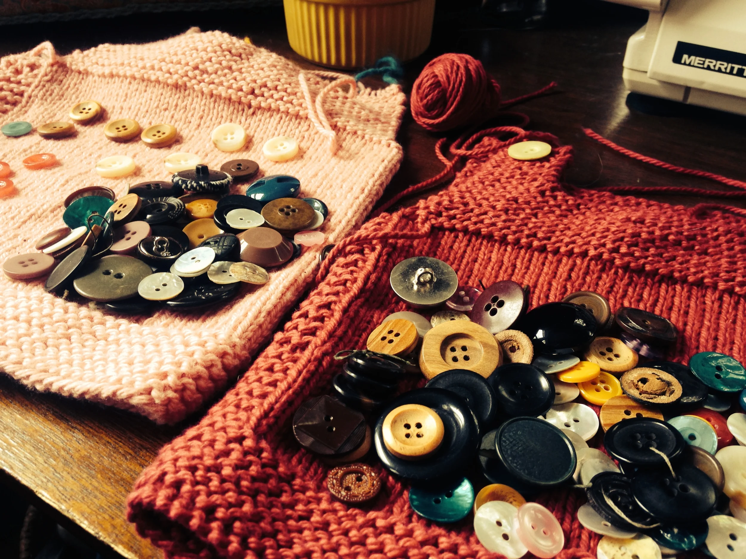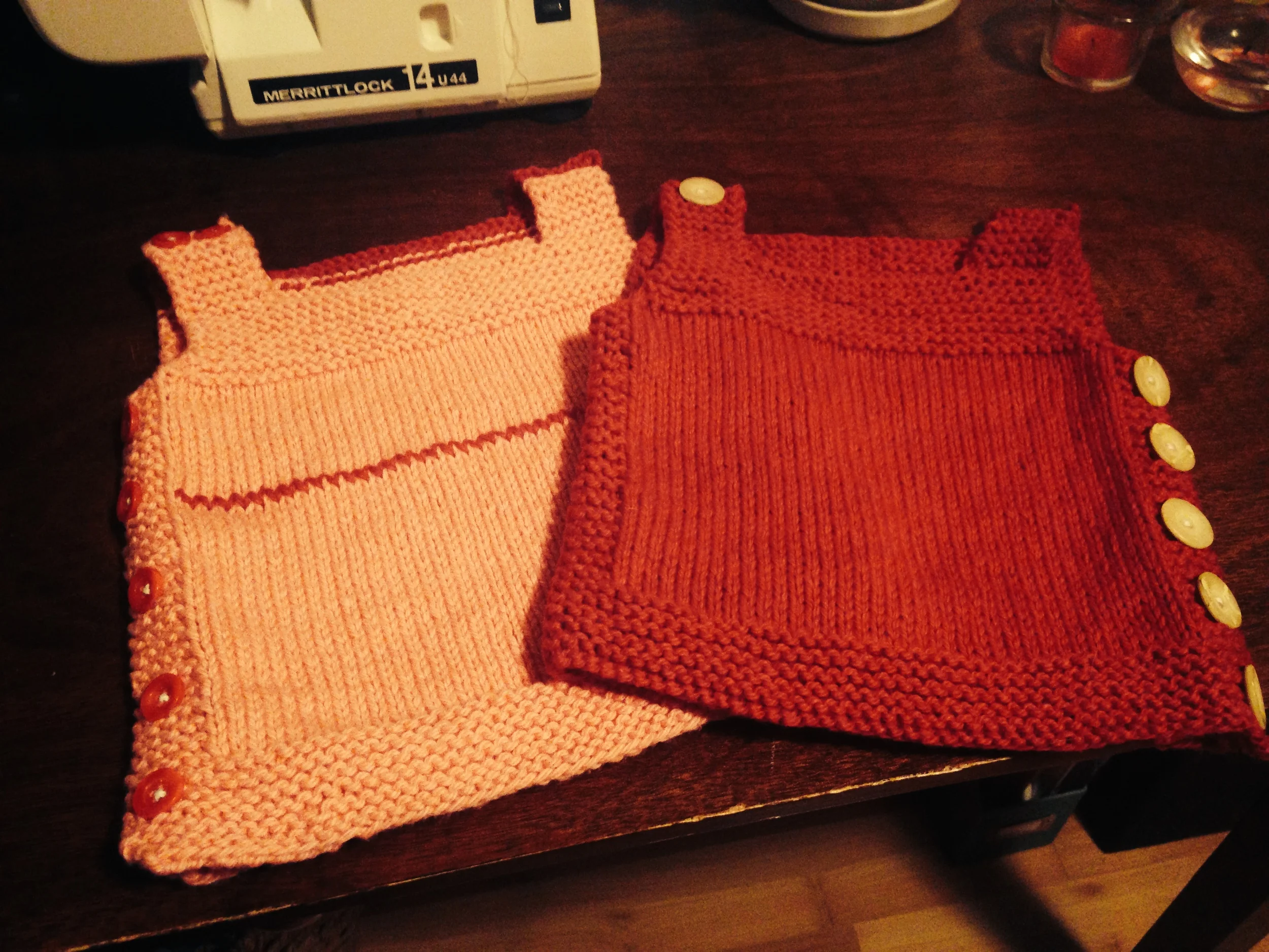 For those of you who catch little details…yes, the dark pink one has it’s side buttons on the opposite side from the light pink vest. As I do most of my knitting while doing other things (i.e. reading, talking, watching things…) sometimes I make mistakes and sometimes I just go with those mistakes! This is one such go-with-it change to the pattern. Ta-da!! Let’s just call it creativity….