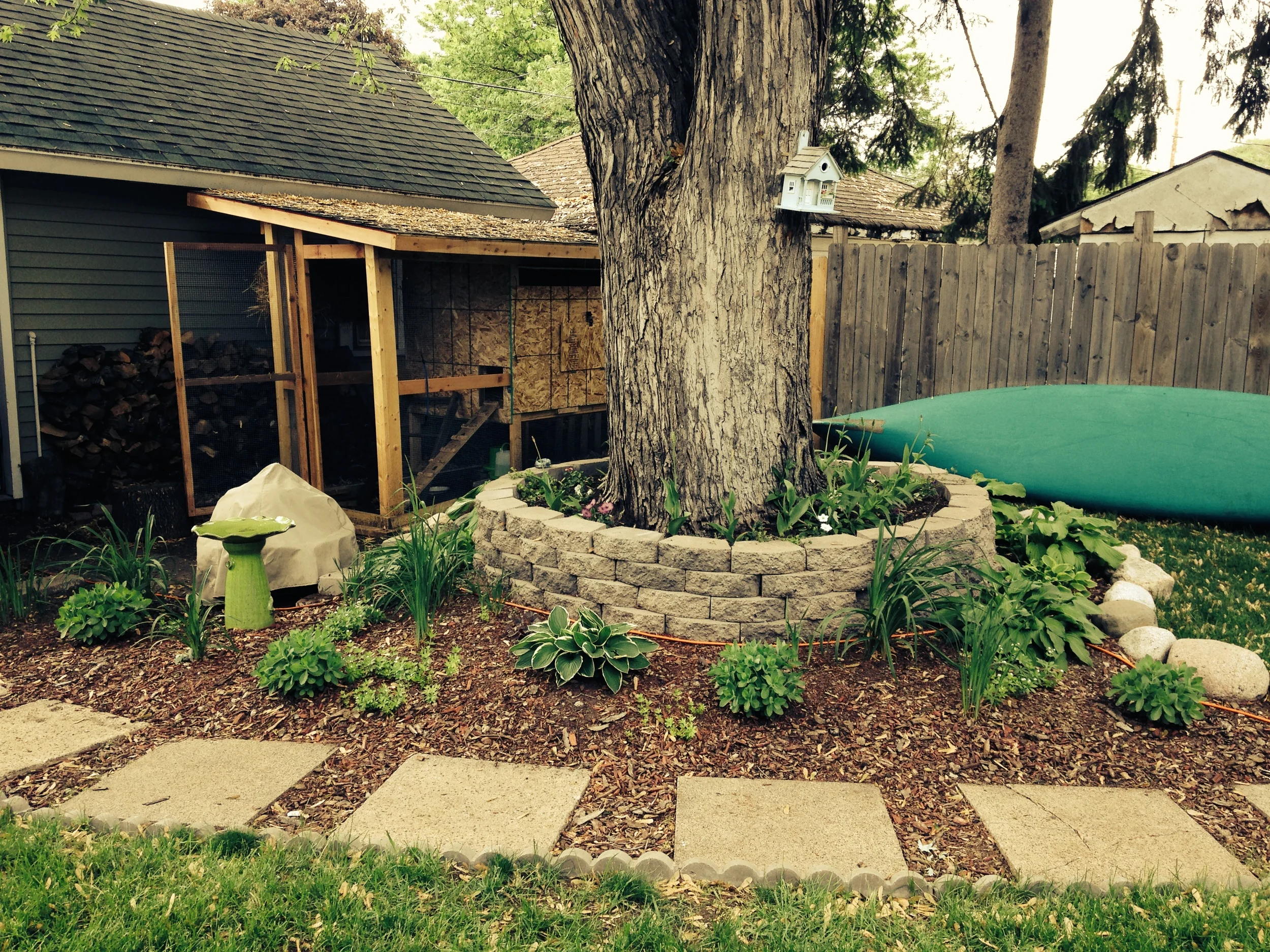 This bed was somewhat established (the bricks and boulders, not the plants) when we bought the house.  I’ve tweaked the spacing of everything a bit and added all of the plants to truly make it my own and to make it a focal point of the back yard.  The space directly around the tree was blooming with tulips a week and a half ago, but is now filled with wave petunias, bacopa, and impatients.  The larger area is filled with different varieties of hostas, Siberian iris, day lilies, sweet woodruff, sedum, coral bells.