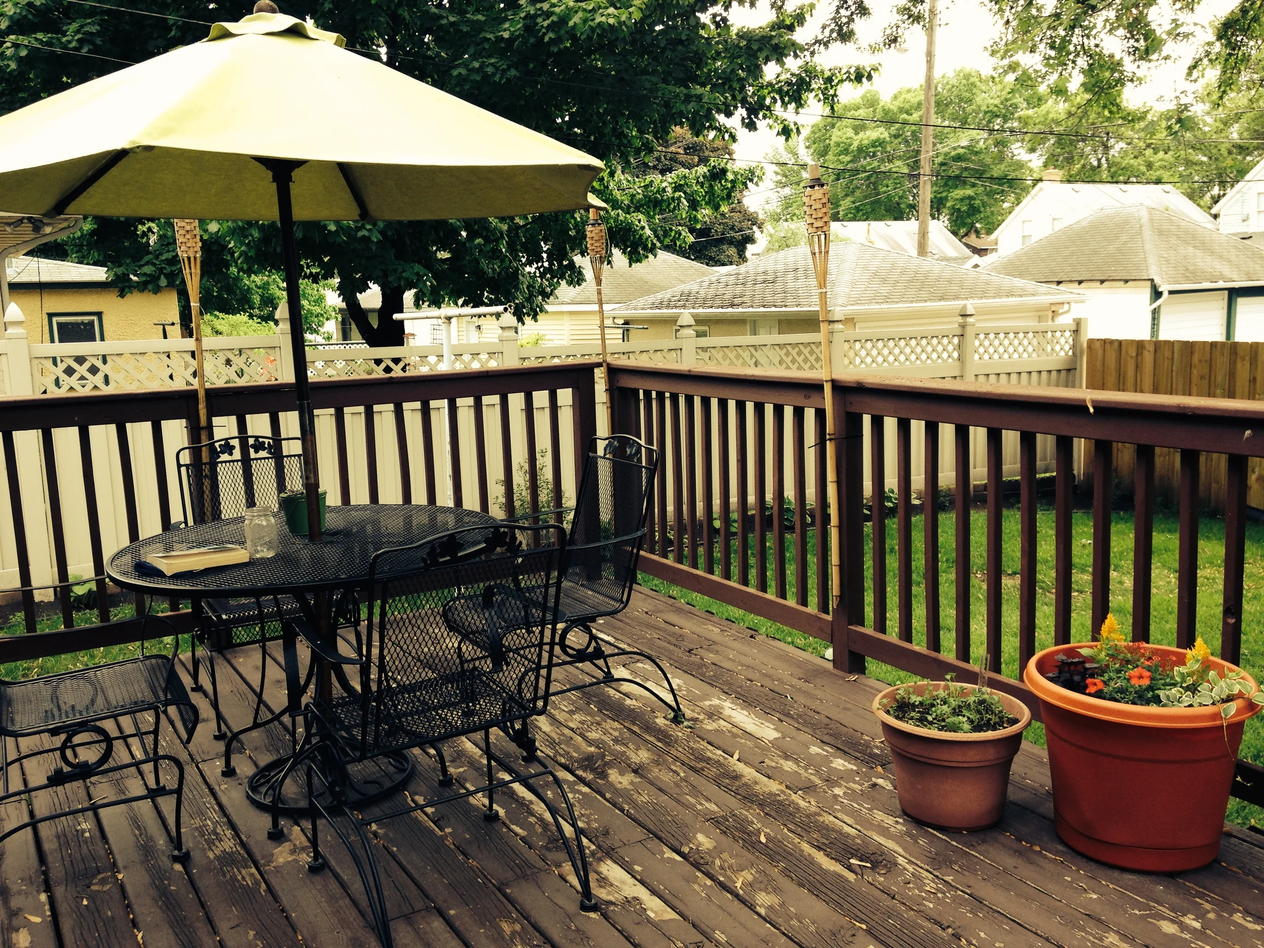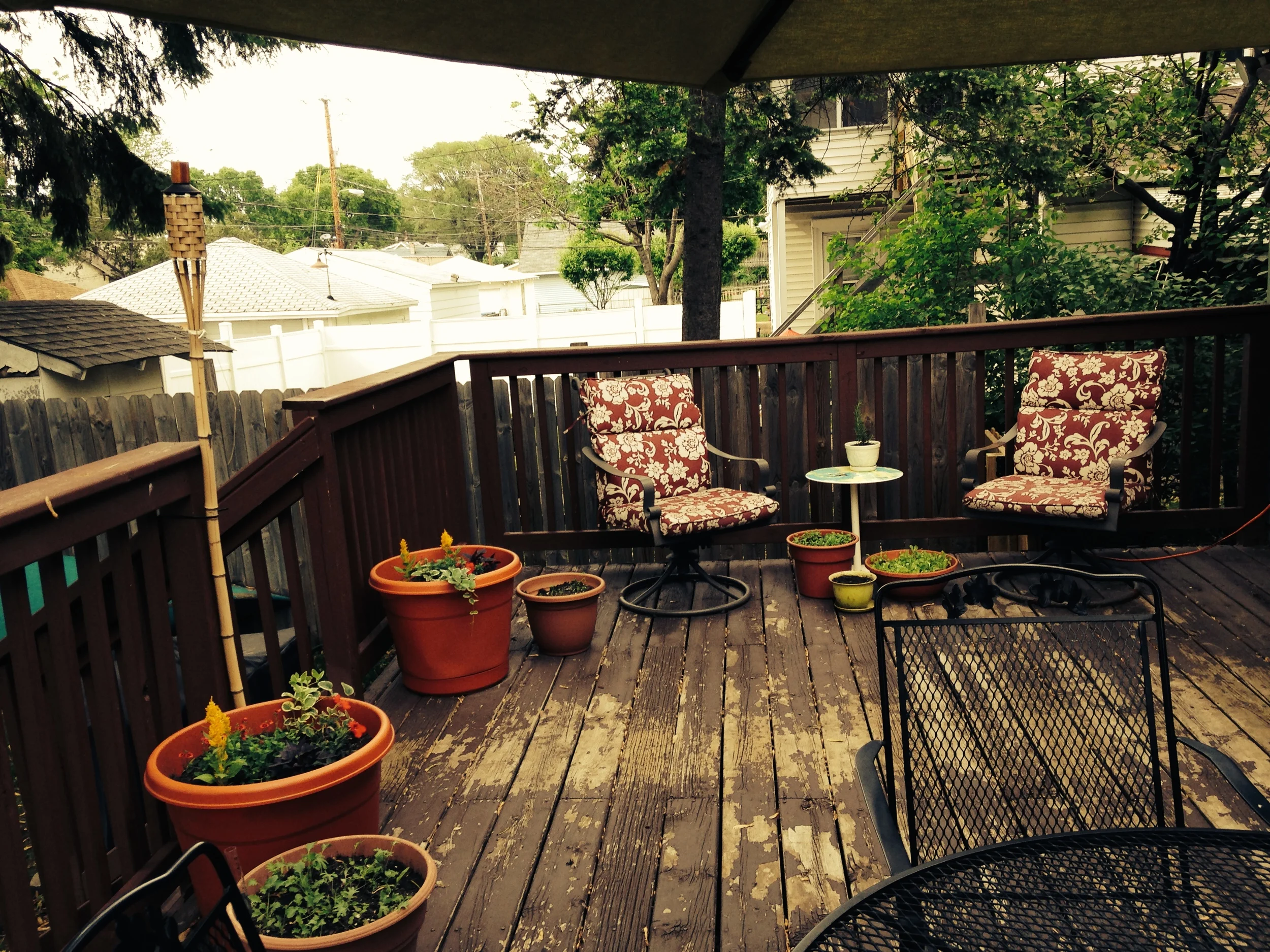 Our deck is one of our favorite places to spend summer days.  My mornings often start with some quite reading and a cup of coffee in those garage sale red chairs, while most of our summer meals are eaten at our hand-me-down table and chairs.  The pots on the deck are filled with annual flowers, annual herbs (a bushy dill variety, rosemary, and cilantro), and greens (mixed greens, and kale).