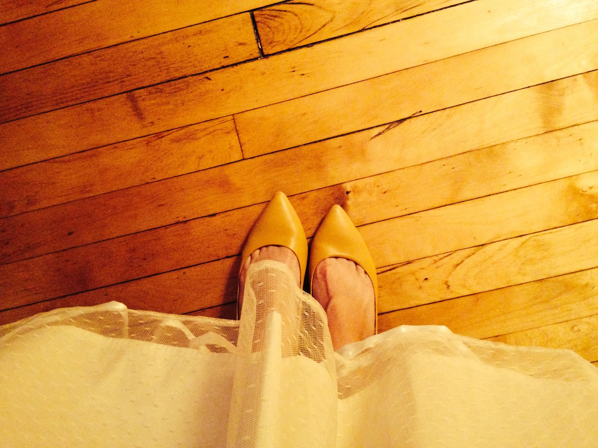 After the white sheet dress was finished, I made a few adjustments and then started on the second sample, this one was made out of an adorable vintage sheet set with bright yellow flowers that I had slept on for years at our beloved cabin. I ended up wearing that dress for my family bridal shower, which was perfectly delightful! Those photos were also lost. Boo.