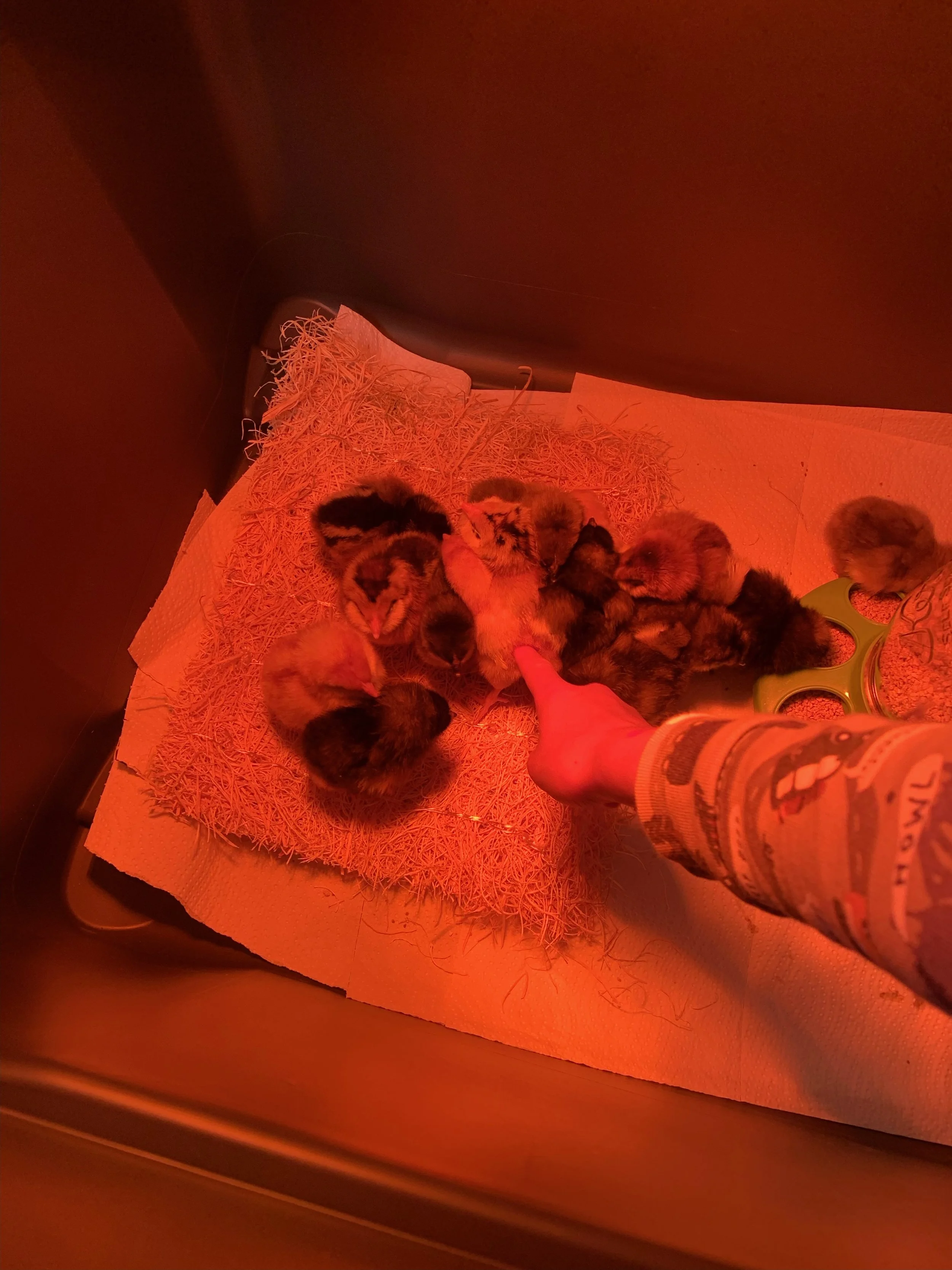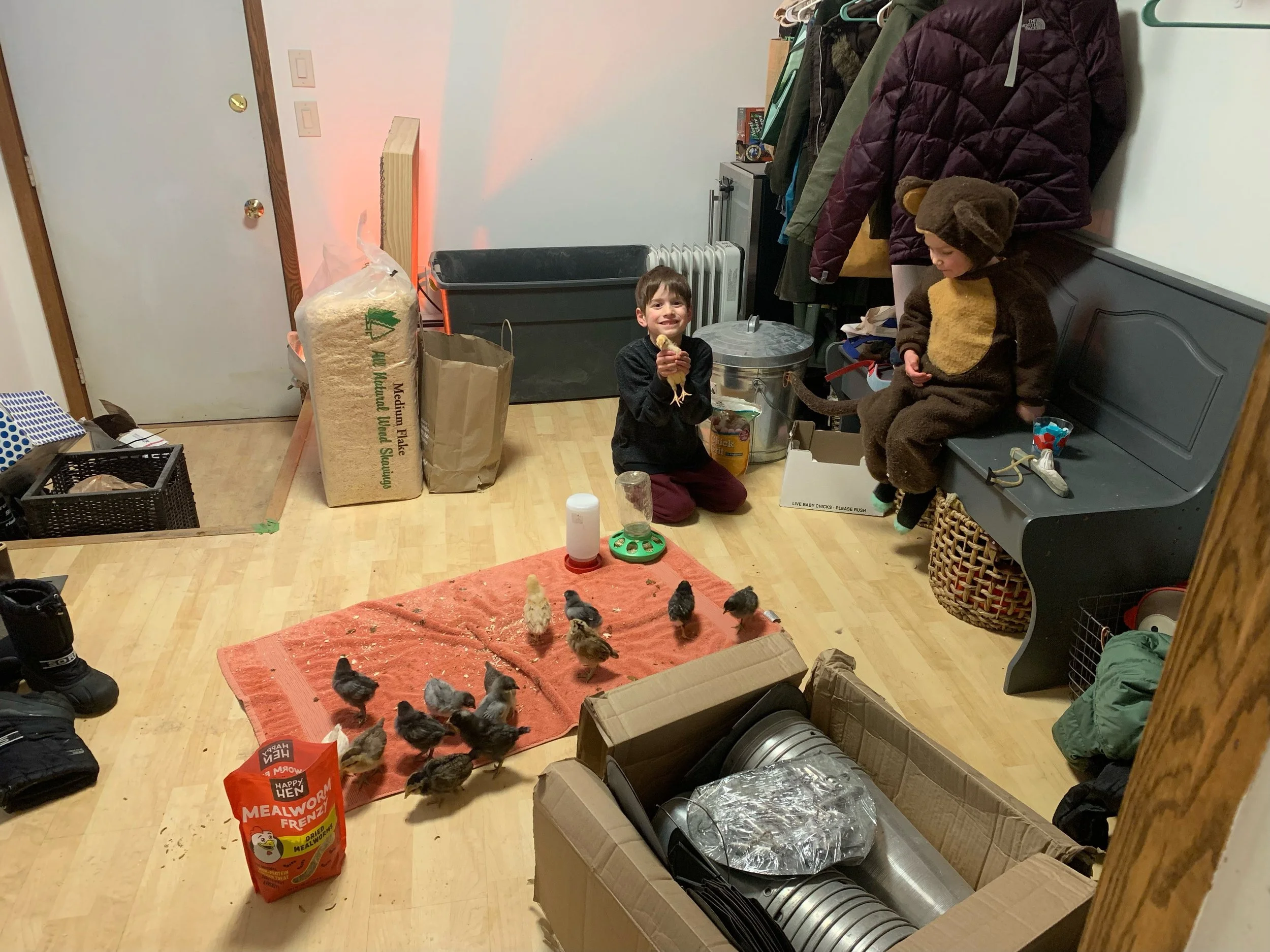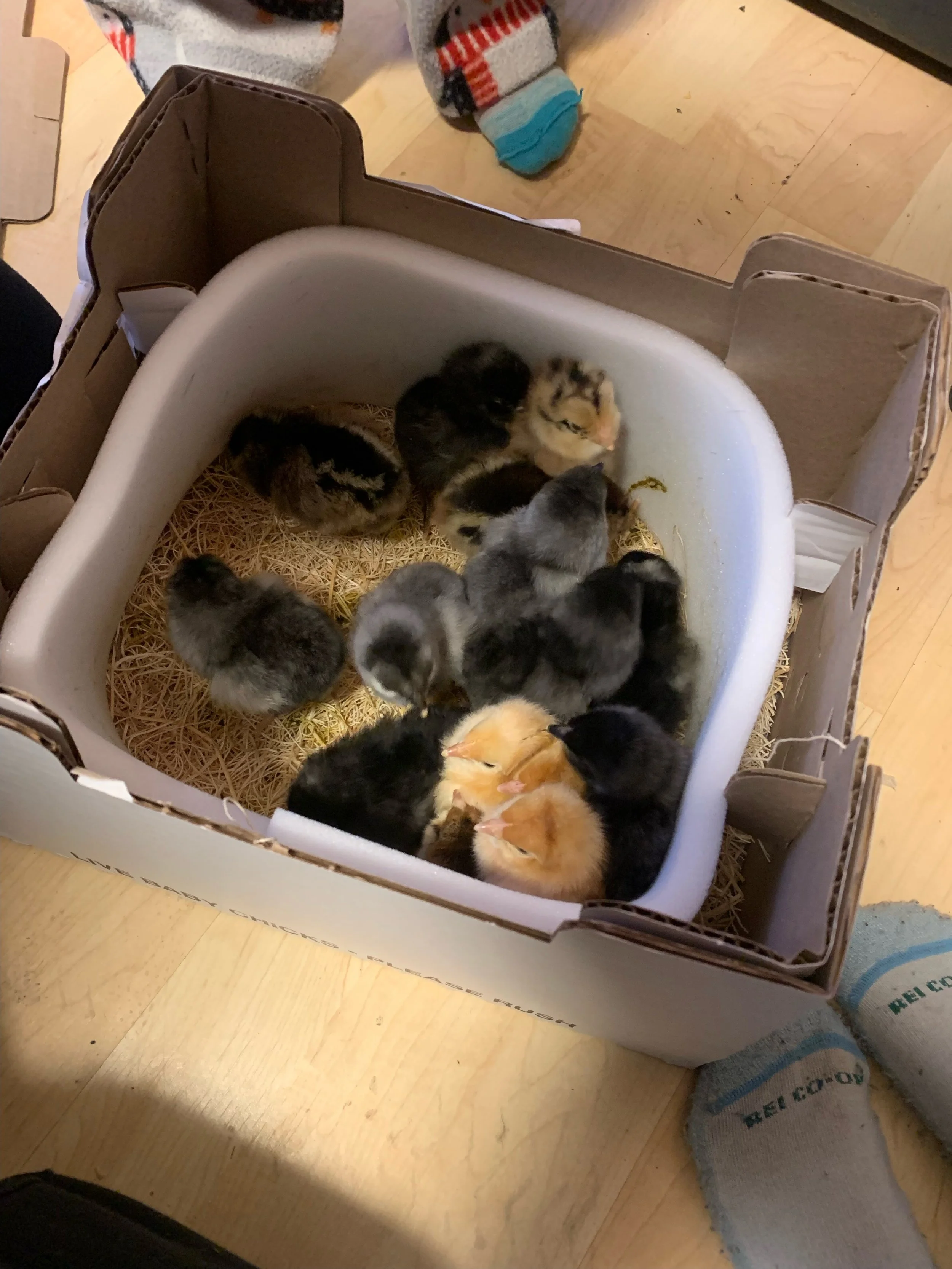 Which brings us to chicks! With so much more space for chickens, we knew we wanted to add quite a few to our flock this year. After doing a bit of research on raising chicks in the winter, we decided to order day-old chicks from a hatchery at the top of February. They came by USPS and arrived at our local post office for pick up early one morning. We ordered from Hoover’s Hatchery in Iowa and were very pleased with the selection, availability, and health of the chicks. We got 15 female chicks of assorted breeds. Five of which lay colored eggs and the other 10 lay brown eggs. Since we got them in the winter, they should start laying eggs by the end of June, which will be fantastic! We have them in our mudroom right now and will likely move them into the garage in the next week or two and then down to the barn after that. We’ve had colder than usual overnight temps, reaching down into the negatives most nights still, so we are having to keep them in the mudroom a week or two longer than we’d hoped. Once they reach 6 weeks, though, they will be fully feathered and will be able to withstand temps down into the 30’s. We will then move down to the barn, where we’ll keep on the garden shed side so they can get used to the rest of the flock and the flock can get used to them. Integrating chicks to an established flock can be very challenging, but I’m hopeful that having more space for them all will make integrating easier than it’s been for us in the past.
