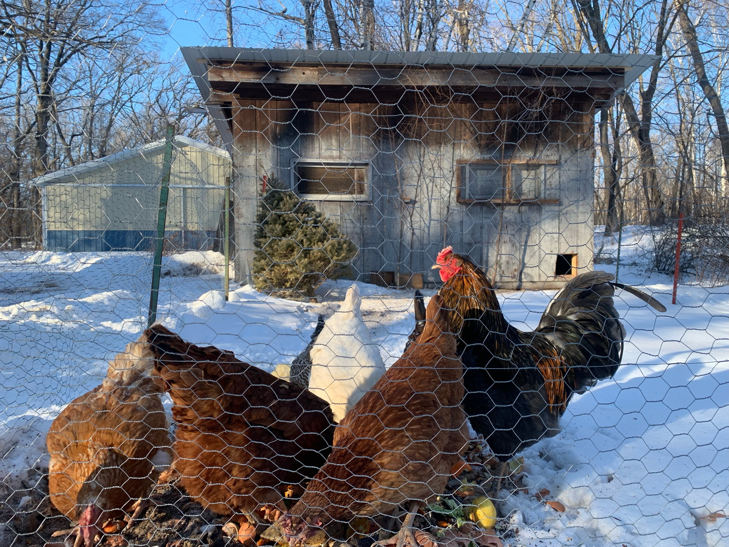 Chickens! It’s been so long since I’ve written about them here or on Instagram, but we managed to keep our flock even though our crazy move and they are now happily settled into their country estate! When we sold our house last June, in 2021, our wonderful buyers agreed to foster our chickens for a few months as we floated around until we found a house to buy. They were extremely gracious with us as we didn’t end up closing on our house until the end of October! The seller of our new home was also wonderfully gracious and he allowed Dan access to the property before we closed so that he could fix up the old goat barn and turn it into a chicken coop. He and my brother Jake tore off the rotting old roof and replaced it with tin. Then Dan built a coop inside the barn on one side and then the other side will be used as a garden shed and a chick brooder. I love the doors he found at a selvage store in Minneapolis! It’s going to look so fun once we put finishing touches on it this summer. The coop also has an automatic door for the chickens that opens and closes on a timer and lets them out into their fenced yard each day. It is awesome. The barn is quite a ways from the house, so the automatic door frees us up to just check on them once a day, instead of twice a day. It will also make it much easier to leave them for a few days.
