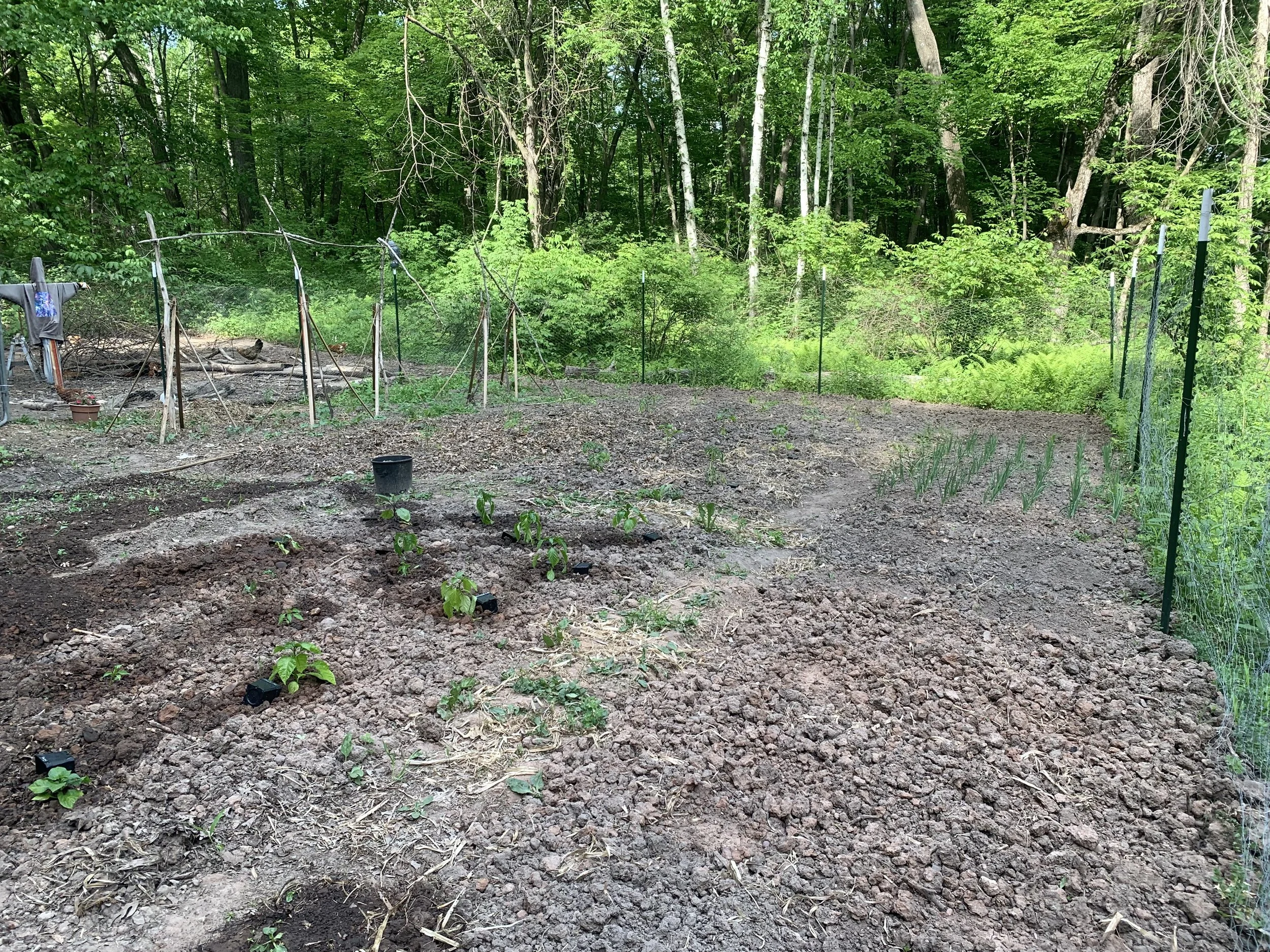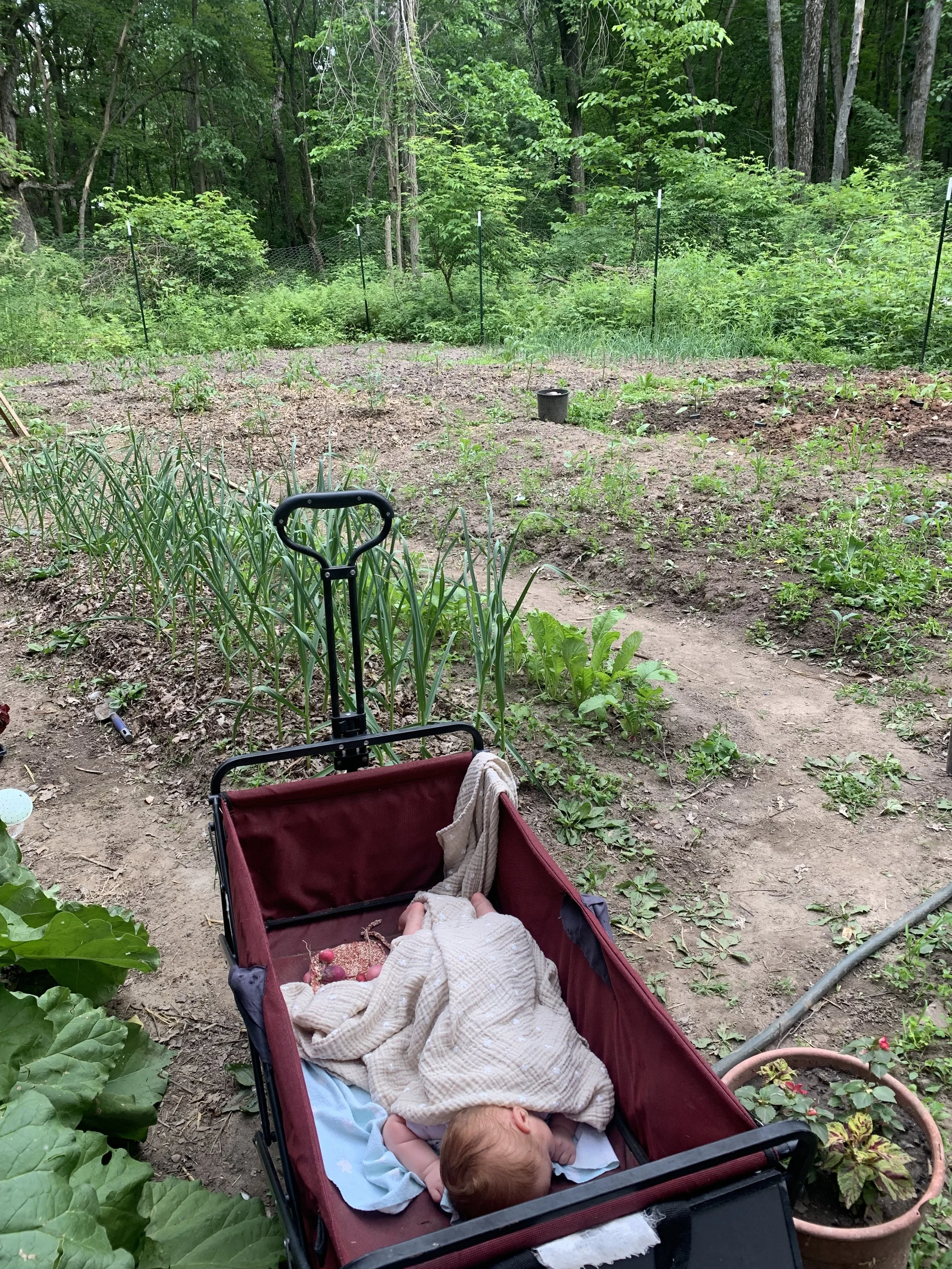 This year’s garden is up and running! It is not an easy feat, though, prepping and planting a garden in the same season as giving birth to a new baby. Dan has been a huge help to me this year, though. We use a broadfork to prep our garden beds and he did all of that work for me so that I could focus on planting. We had a long winter with many inches of snow remaining into the first week or so of April. But a sudden hot streak in the 80’s quickly melted what remained and dried up the ground enough for me to get most of my cool weather seeds into the ground before Ash was born. Cool weather the end of April and beginning of May also bought me time before I needed to start planting the rest, so I was able to enjoy a few weeks of slow postpartum days without feeling too much of the itch to get down to the garden.
